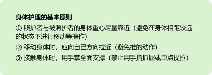 由于双方身体重心靠近,有助于预防照护者腰痛;同时因面对面,可随时观察对方表情和反应,并及时进行语言沟通,告知下一步操作。见图① -